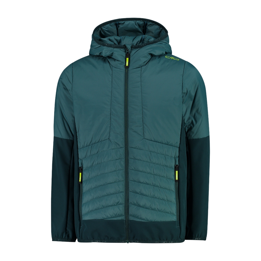 Chłopięca hybrydowa kurtka z kapturem. Funkcjonalny model, który dobrze sprawdza się na co dzień i podczas aktywności outdoorowych. Hydrofobowe wykończenie ogranicza wchłanianie wilgoci. Zastosowane ocieplenie lub miękkie wnętrze pomagają utrzymać ciepło w chłodniejsze dni.