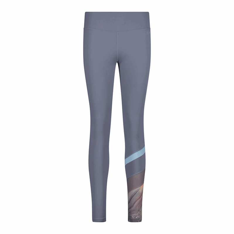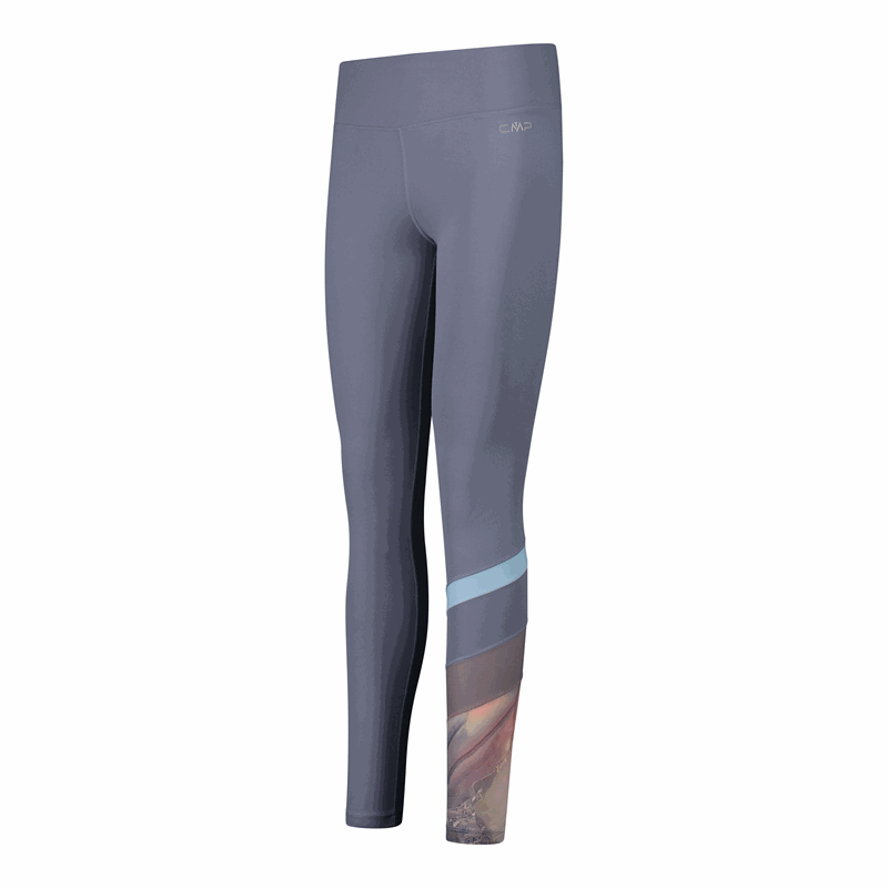 Damskie legginsy CMP 32C3936/N988 z kolekcji Leisure to dopasowany model o pełnej długości z szerokim, wysokim pasem w talii. Gładka, niebieska baza została przełamana kontrastową wstawką i graficznym nadrukiem na dole jednej nogawki, a małe logo na biodrze podkreśla sportowy charakter. Elastyczna dzianina z dodatkiem elastanu pracuje z ruchem, a płaskie szwy w okolicy bioder pomagają utrzymać wygodę podczas aktywności.