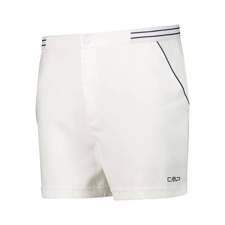 Te męskie spodenki CMP z kolekcji Leisure to lekki, prosty model o długości do połowy uda. Uszyte z poliestrowej gabardyny, mają zapięcie na guzik, szlufki na pasek oraz wpuszczane kieszenie po bokach. Charakterystycznym detalem są paskowane wstawki po bokach pasa, a podwinięte nogawki z przeszyciem nadają całości schludne wykończenie. Materiał wykorzystuje technologię Dry Function, która wspiera komfort podczas ruchu.