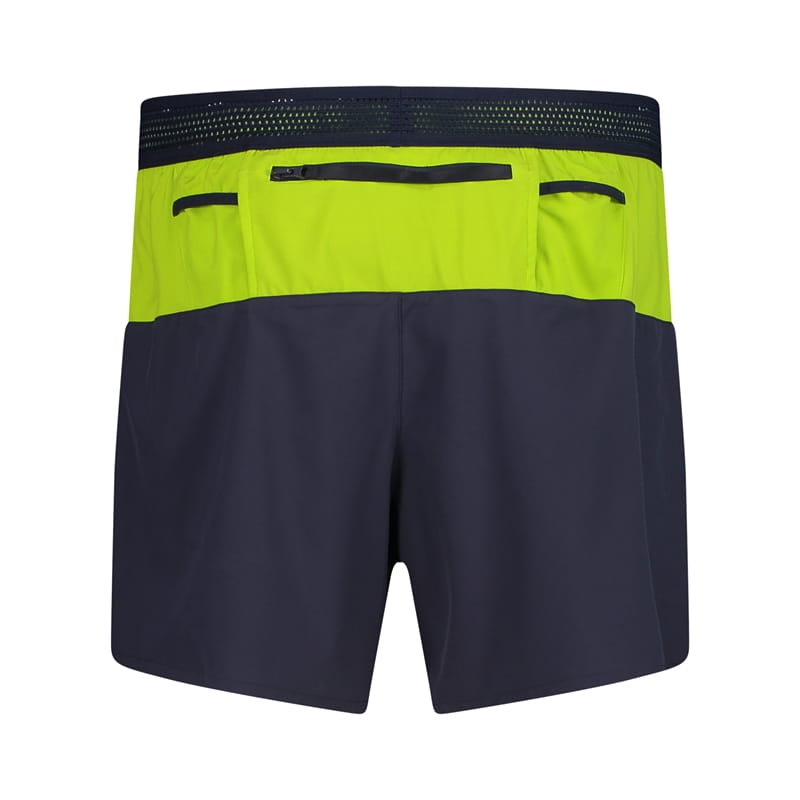 Sportowe spodenki męskie CMP z kolekcji Unlimitech to krótki model o regularnym, luźniejszym kroju i długości do połowy uda. Zielona, gładka tkanina została przełamana granatowymi panelami u dołu nogawek oraz szerokim, elastycznym pasem z perforowanym wzorem. Po bokach znajdują się kieszenie, a pionowe odblaskowe wstawki przy ich krawędziach zwiększają widoczność w słabszym świetle. Całość uzupełnia niewielkie logo na nogawce.