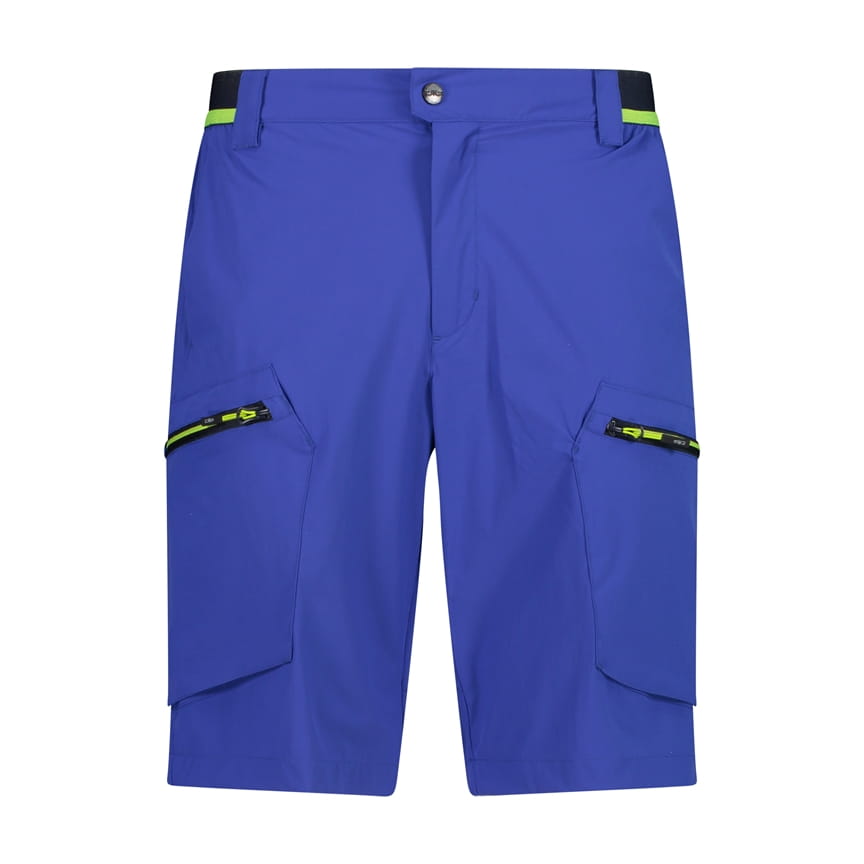Niebieskie spodenki męskie CMP z linii Unlimitech to funkcjonalne bermudy o prostym kroju do kolan. Uszyto je z lekkiej, elastycznej tkaniny, która dobrze sprawdza się w ruchu. W pasie zastosowano zapięcie na guzik, szlufki na pasek oraz kontrastowe wstawki w kolorze czarnym i limonkowym. Na co dzień i w terenie przydają się praktyczne kieszenie: dwie boczne z przodu oraz dwie kieszenie cargo na udach zapinane na zamek, z kontrastowymi limonkowymi detalami przy suwakach.