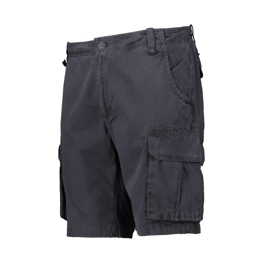 Ciemnoszare spodenki męskie CMP 3U66477/U423 to klasyczne bermudy cargo o prostym kroju i długości do okolic kolan. W pasie zastosowano zapięcie na guzik oraz szlufki, które ułatwiają noszenie z paskiem. Model ma dwie wsuwane kieszenie boczne oraz dwie kieszenie cargo na udach z klapkami – wygodne na drobiazgi, które warto mieć pod ręką. Gładka, bawełniana tkanina dobrze sprawdza się w codziennym użytkowaniu.