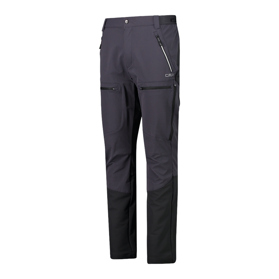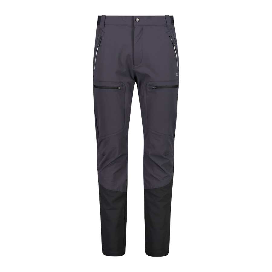 Te męskie spodnie CMP z kolekcji Unlimitech to techniczny model trekkingowy o prostym, lekko dopasowanym kroju. Gładka tkanina z kontrastowymi wstawkami w dolnej części nogawek dobrze sprawdza się podczas aktywności w terenie, a elastyczność w 4 kierunkach wspiera swobodę ruchu. W pasie zastosowano zapięcie na guzik oraz szlufki na pasek. Praktyczne rozmieszczenie kieszeni obejmuje dwie kieszenie biodrowe na zamki i dwie kieszenie na udach z poziomymi zamkami. Profilowane kolana poprawiają komfort w marszu, a elastyczny dół nogawek pomaga utrzymać dopasowanie przy bucie.