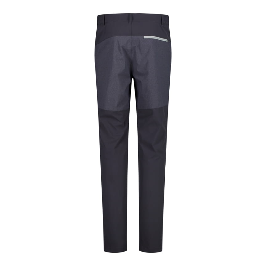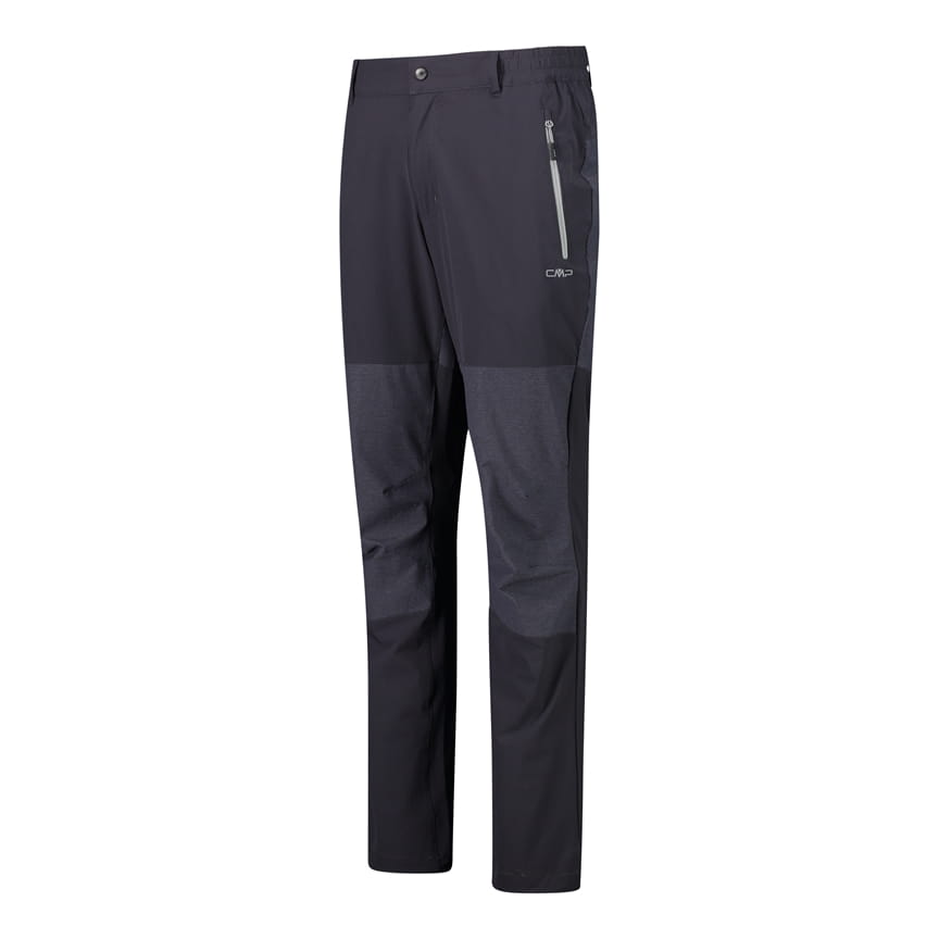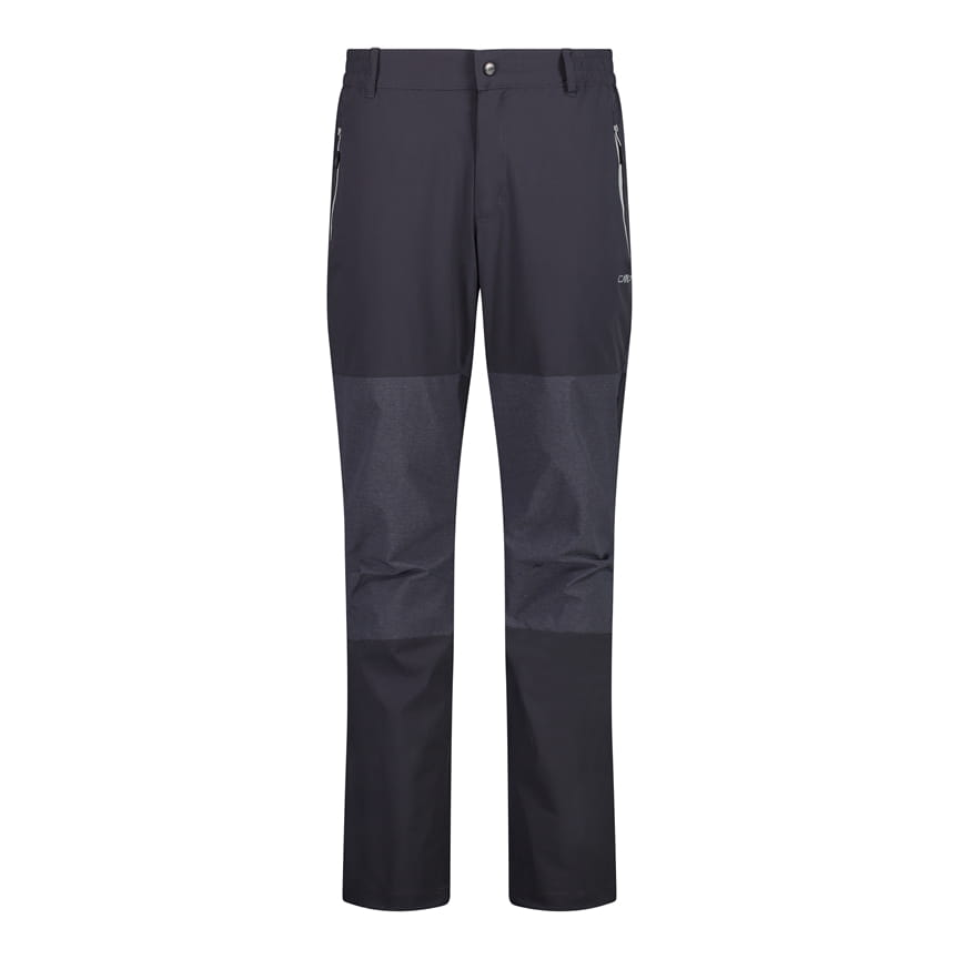 CMP 30T6877/41UG to męskie spodnie outdoorowe o prostych nogawkach, zaprojektowane z myślą o trekkingu i aktywnościach w terenie. Model ma zapięcie w pasie na guzik zatrzaskowy i rozporek z przodu, szlufki na pasek oraz dwie boczne kieszenie zapinane na zamki z kontrastową taśmą. Wstawki materiałowe w innym odcieniu na kolanach i w dolnej części nogawek podkreślają techniczny charakter, a małe logo CMP na udzie dopełnia całość.