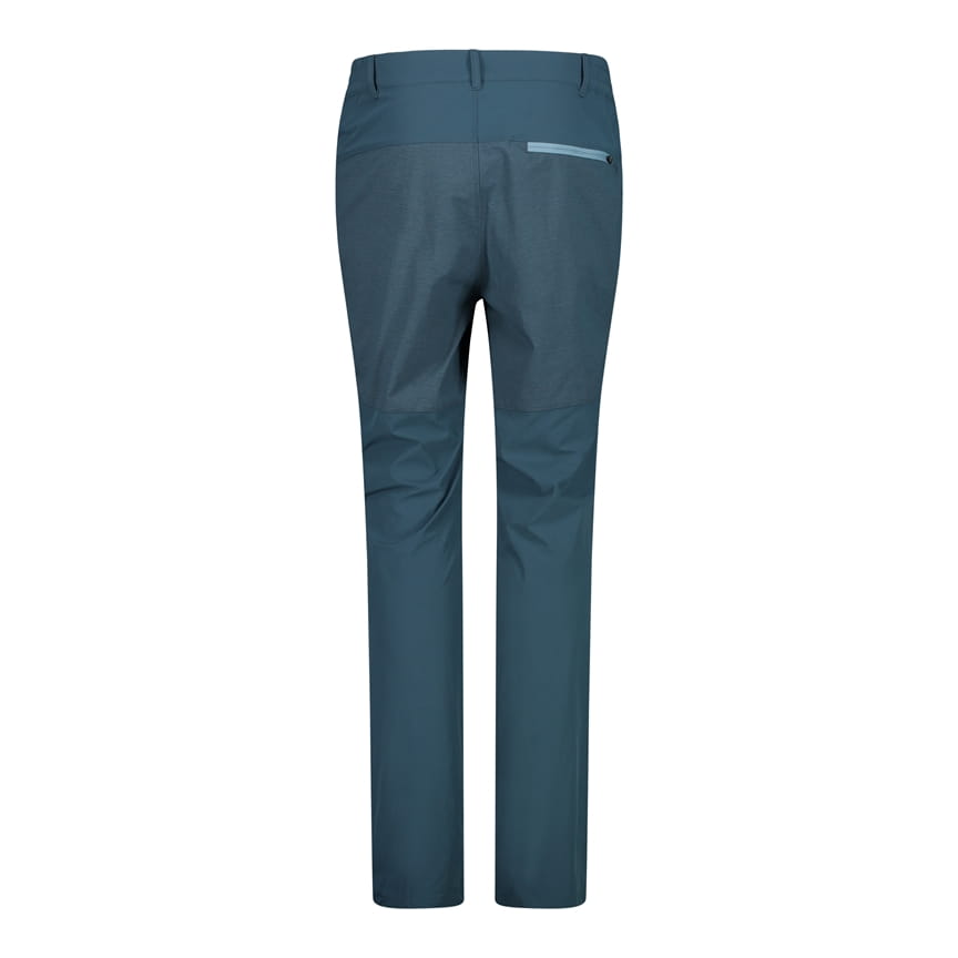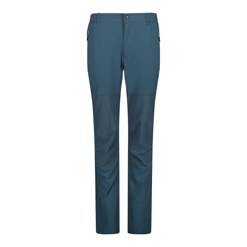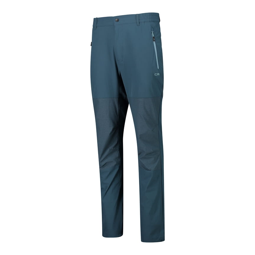 CMP 30T6877/E905 to męskie spodnie outdoorowe o prostych nogawkach, utrzymane w niebieskiej kolorystyce z ciemniejszymi, kontrastowymi panelami na dolnej części nogawek. W pasie zastosowano zapięcie na guzik oraz rozporek z przodu, a szlufki pozwalają nosić pasek. Po bokach znajdują się dwie kieszenie z pionowymi zamkami, a całość uzupełnia małe logo CMP na lewej nogawce. Elastyczna konstrukcja 4 Way Stretch wspiera swobodę ruchu, a Dry Function pomaga sprawniej odprowadzać wilgoć podczas aktywności.