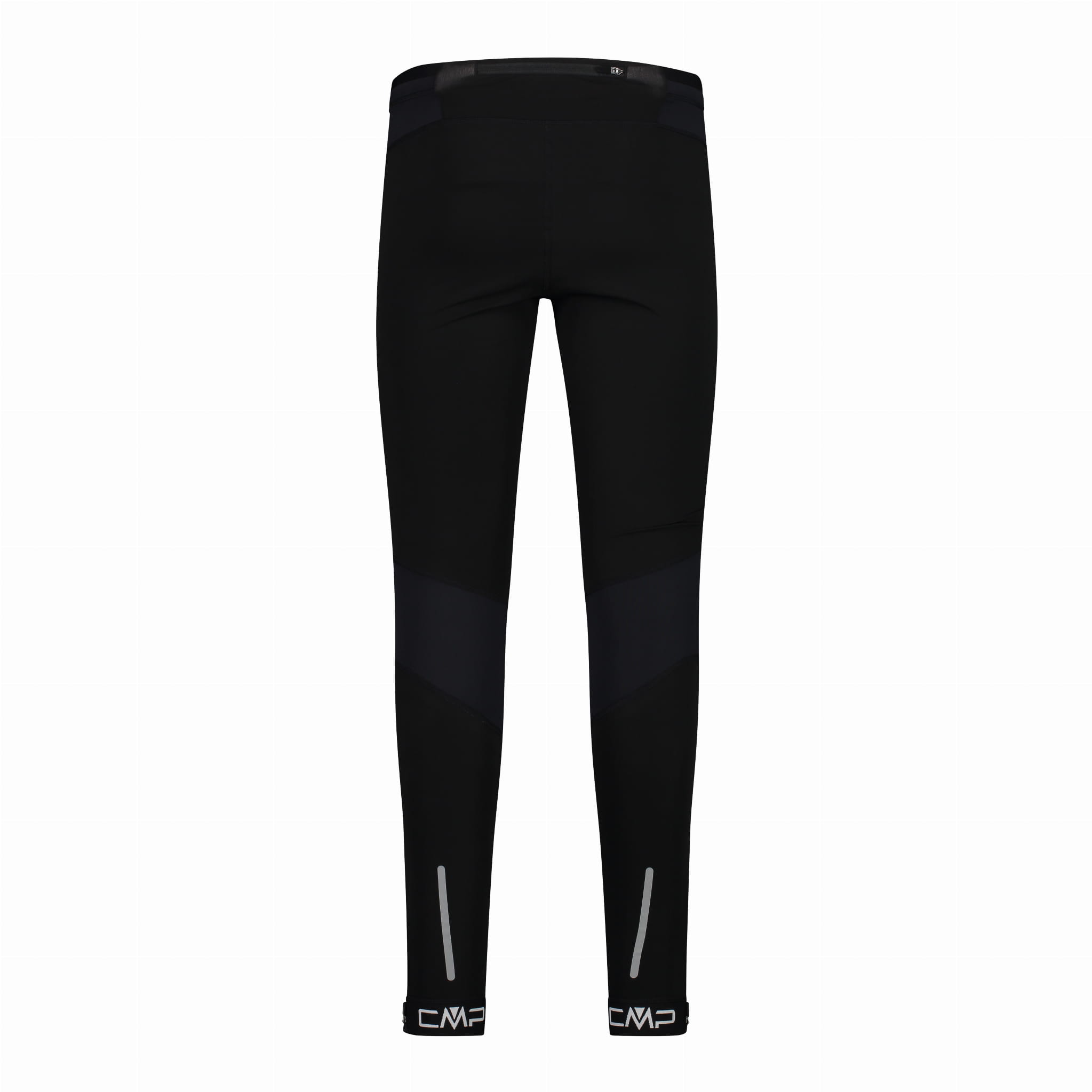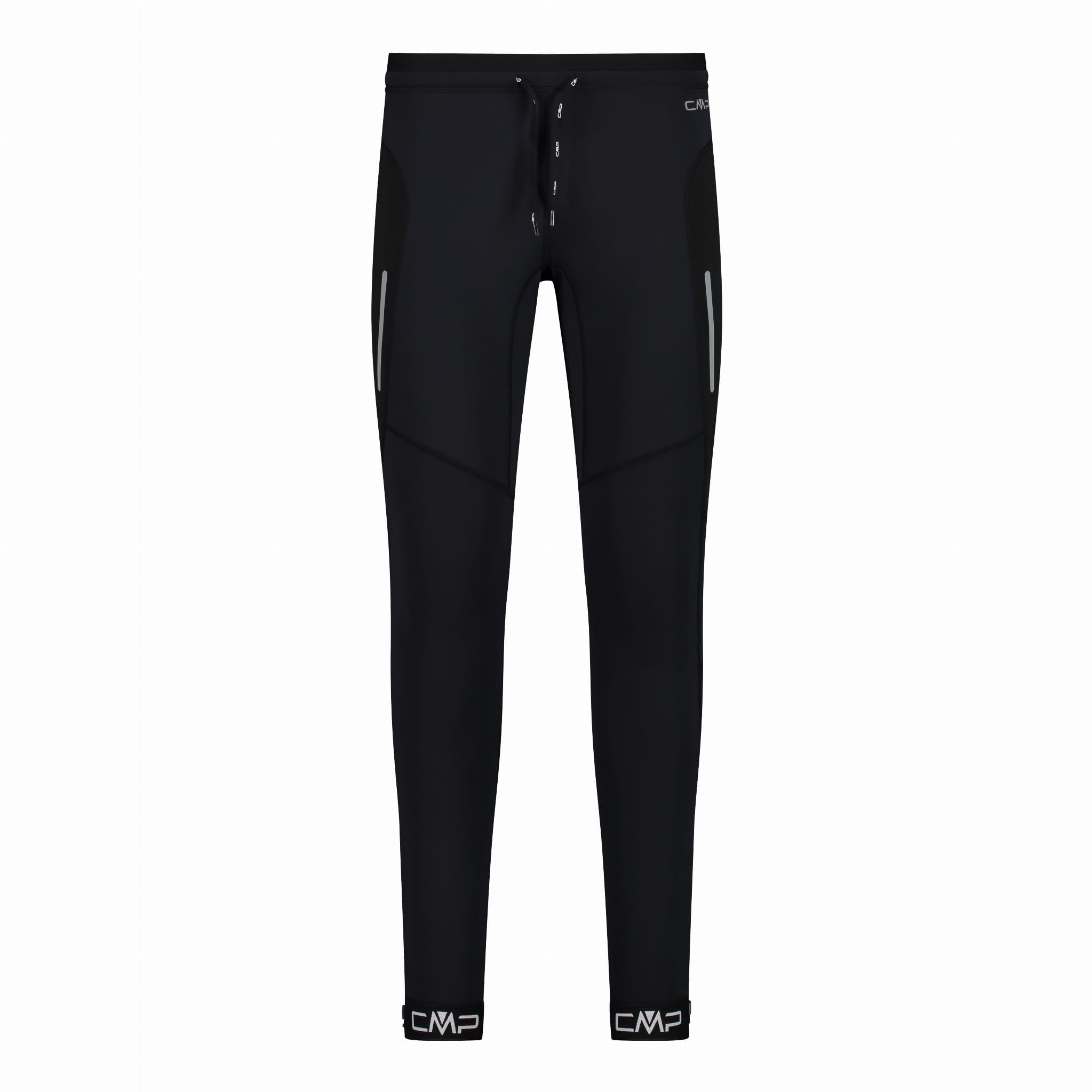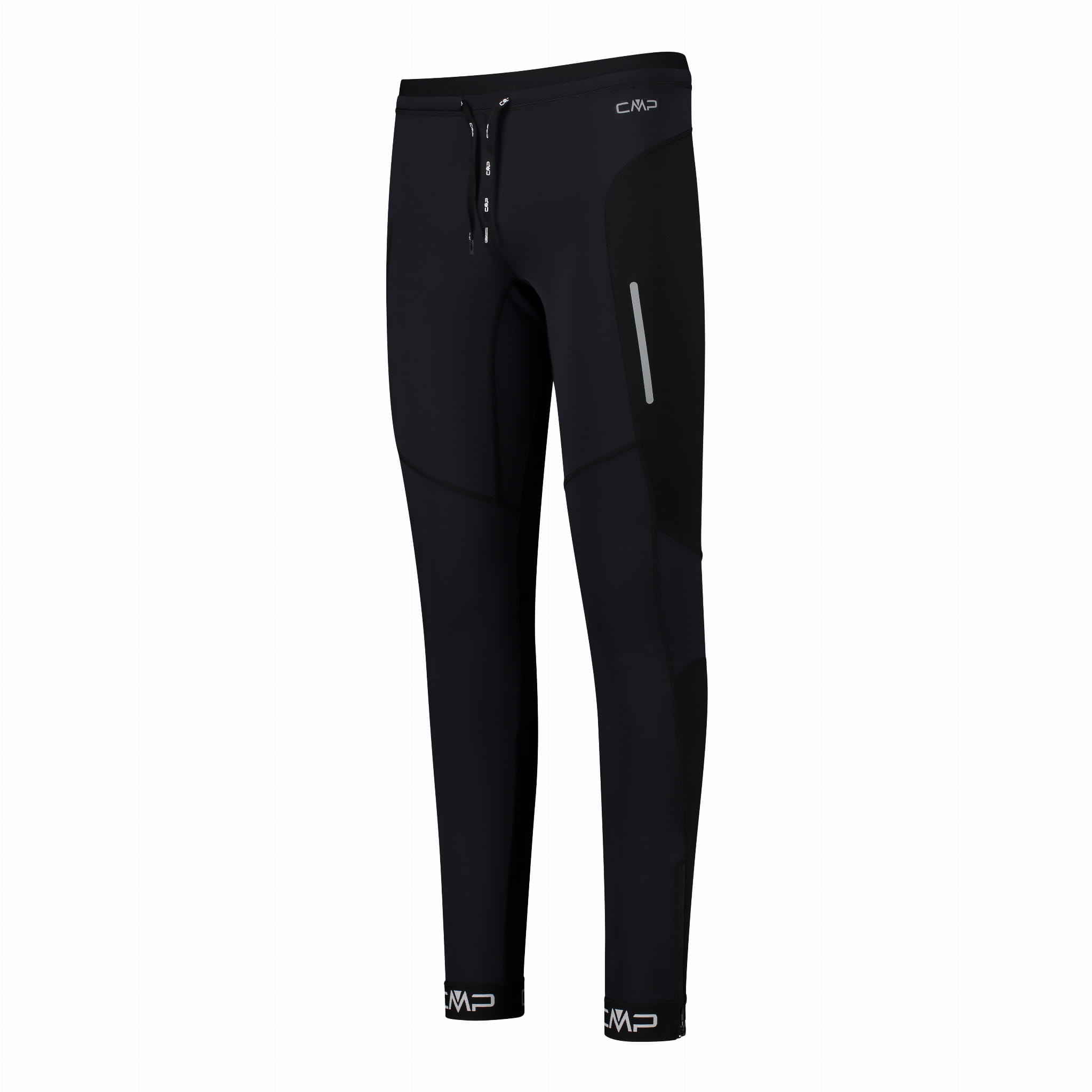 Czarne, długie spodnie sportowe CMP 32T2807/U901 o dopasowanym kroju z wąskimi nogawkami. Elastyczny pas ze sznurkiem ułatwia stabilne ułożenie w talii, a profilowane przeszycia i panele w okolicy kolan wspierają swobodę ruchu. Po bokach znajdują się dwie kieszenie zapinane na zamki, a pionowe odblaskowe wstawki przy kieszeniach poprawiają widoczność po zmroku. Dół nogawek wykończono elastycznymi mankietami z wyraźnym brandingiem CMP.