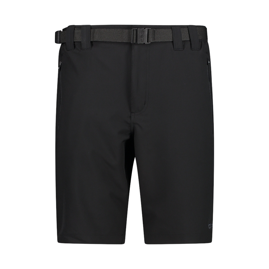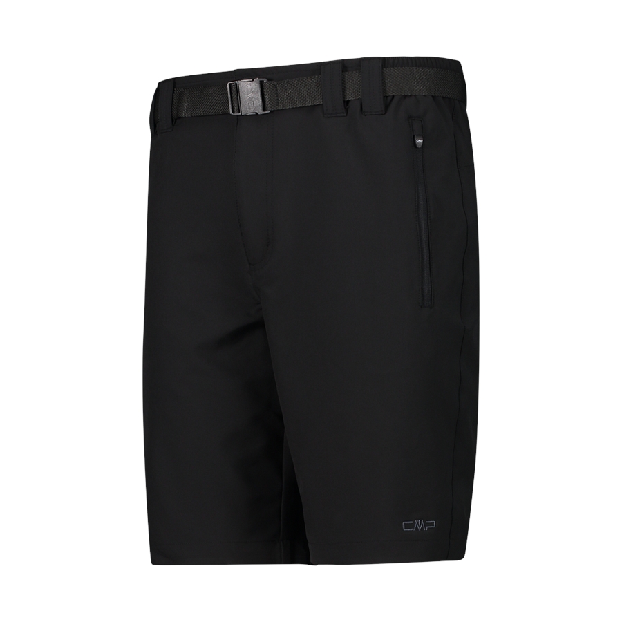 Czarne bermudy outdoorowe CMP 3T51847/U901 to lekkie męskie krótkie spodenki o prostej nogawce i długości do okolic kolan. Elastyczna tkanina 4-way stretch wspiera swobodę ruchu podczas marszu, a pas ze szlufkami i dołączonym paskiem z klamrą ułatwia stabilne dopasowanie. Z przodu znajduje się rozporek, a dwie boczne kieszenie zapinane na zamek pomagają bezpiecznie schować drobiazgi. Minimalistyczny, gładki wygląd uzupełnia małe logo przy dolnej krawędzi nogawki.