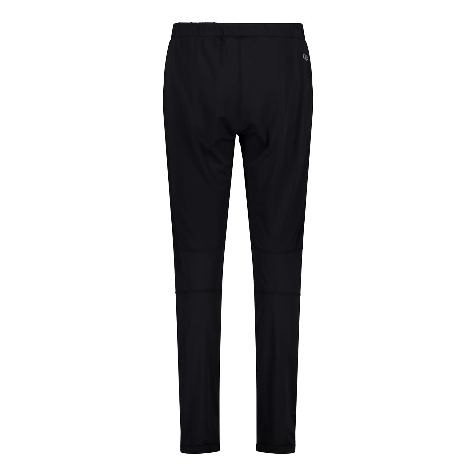 Hybrydowe spodnie męskie CMP z kolekcji Unlimitech to techniczny model w czarnym kolorze, zaprojektowany z myślą o swobodzie ruchu podczas zimowych aktywności. Prosty krój z lekko zwężanymi nogawkami łączy się tu z ergonomicznym dopracowaniem, m.in. dzięki profilowanym kolanom. W pasie zastosowano zapięcie na guzik oraz szlufki na pasek. Dwie boczne kieszenie zapinane na zamki pomagają bezpiecznie schować drobiazgi, a odblaskowe wstawki w okolicy kolan poprawiają widoczność po zmroku. Dół nogawek ma rozpięcie, co ułatwia dopasowanie do obuwia.