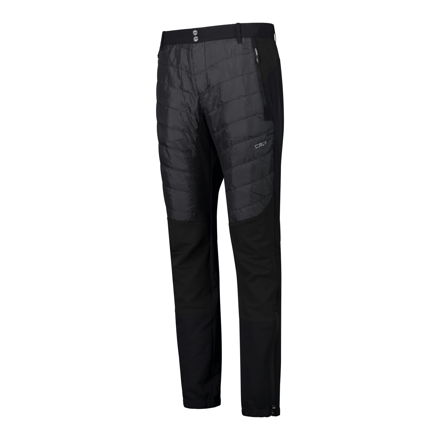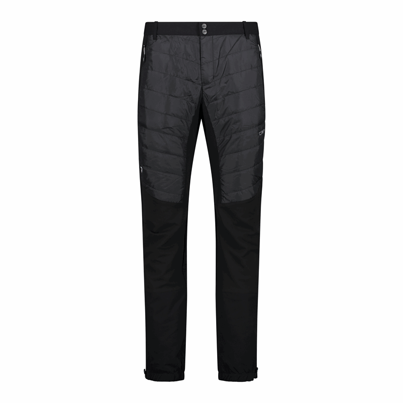 Czarne spodnie męskie CMP Unlimitech 39T0017 to ocieplany model o prostych nogawkach i standardowej wysokości stanu, zaprojektowany z myślą o chłodniejszych dniach. Z przodu ud zastosowano pikowane panele z widoczną, lekko ocieplaną konstrukcją, a dolna część nogawek pozostaje gładka, co nadaje całości bardziej techniczne wykończenie. W pasie znajduje się zapięcie na dwa zatrzaski oraz szlufki na pasek. Dwie boczne kieszenie na zamki pomagają bezpiecznie przechować drobiazgi, a krótkie zamki przy dole nogawek ułatwiają regulację obwodu nad butem.