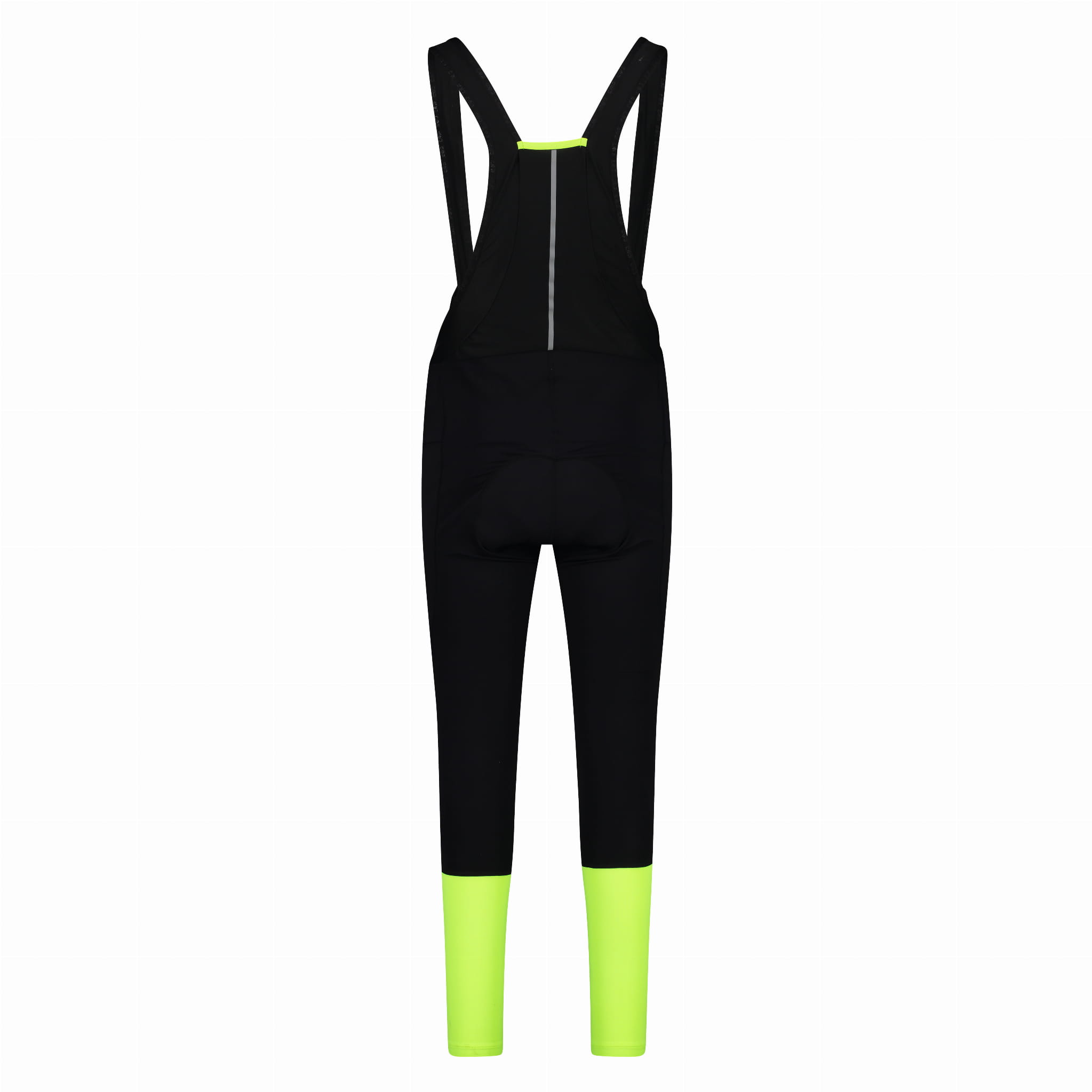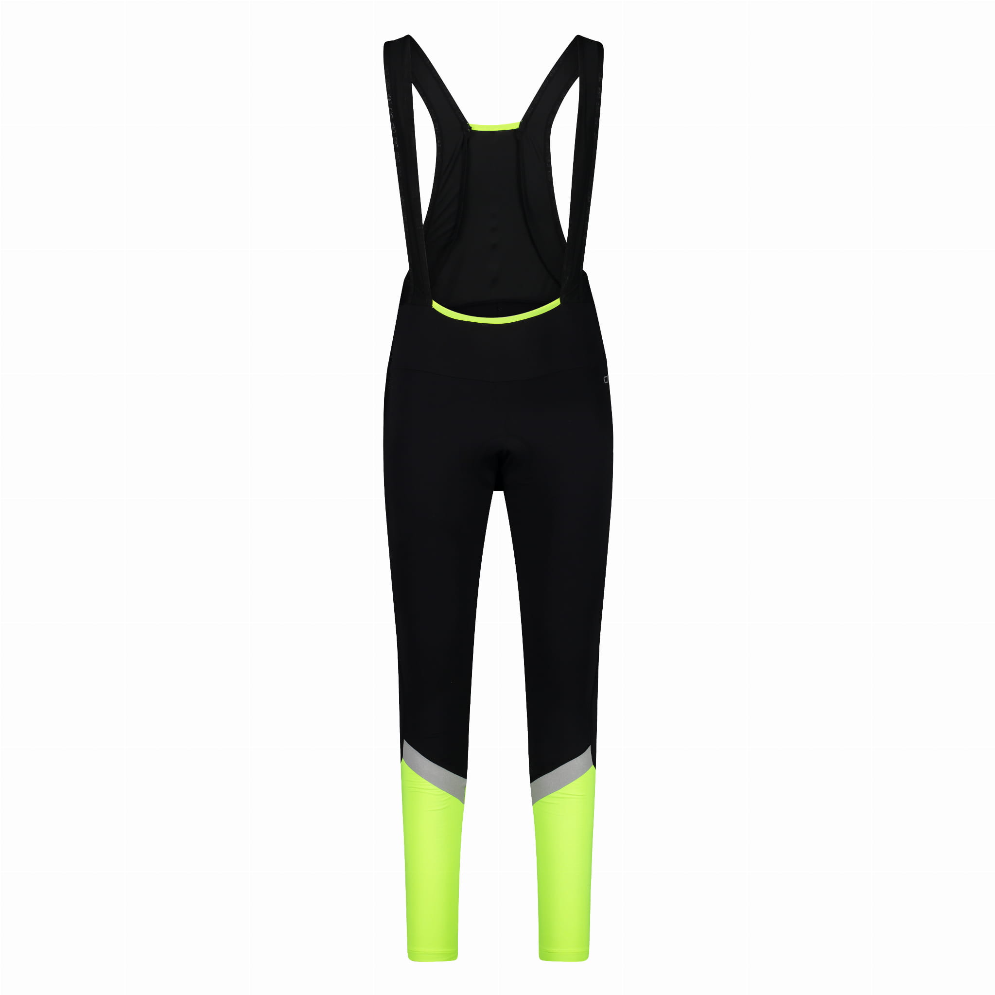 Długie męskie spodnie kolarskie CMP z kolekcji BIKE w formie ogrodniczek to dopasowany model z szerokimi szelkami i zabudowanym panelem na plecach. Czarna, gładka baza została uzupełniona kontrastowymi detalami: neonowymi wstawkami przy dole nogawek, szarymi ukośnymi pasami na łydkach oraz elementami odblaskowymi, które zwiększają widoczność po zmroku. W środku zastosowano wkładkę silikonową o konstrukcji trzech gęstości – zaprojektowaną z myślą o komforcie podczas długich tras.