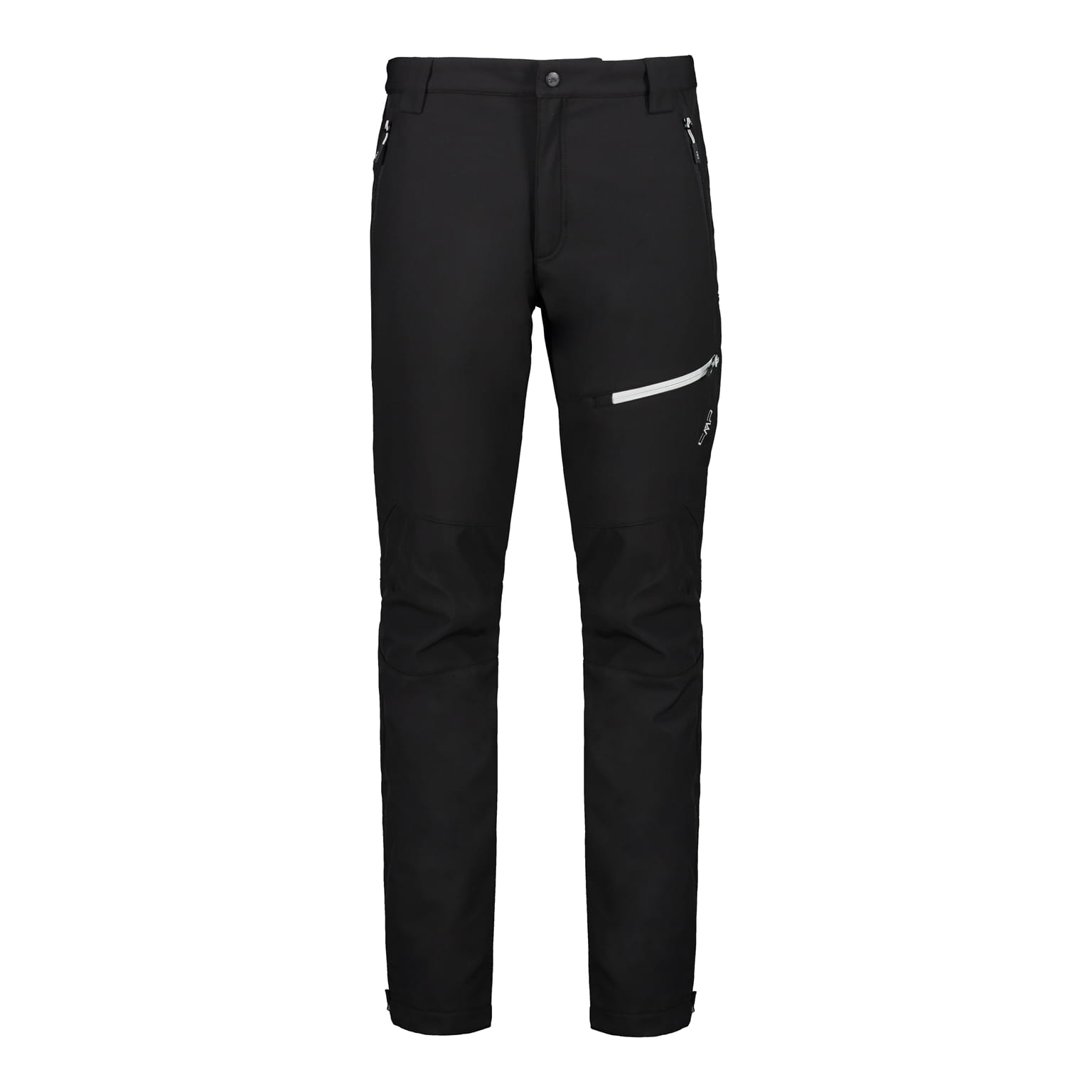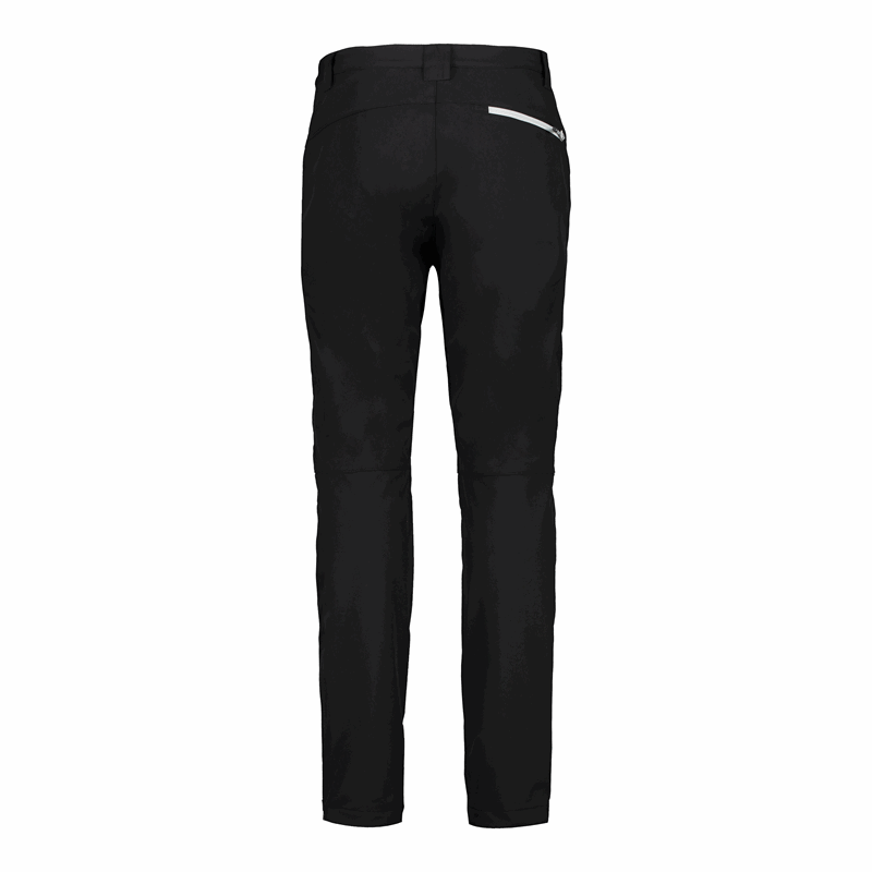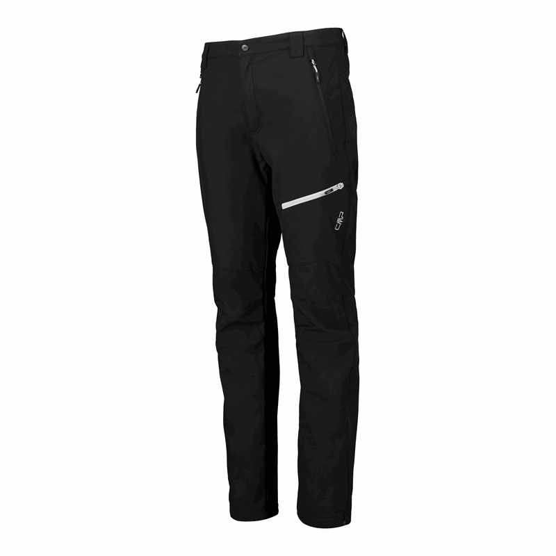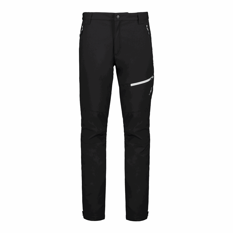 CMP 30A1477/U901 to męskie spodnie outdoorowe typu softshell w czarnym kolorze, zaprojektowane do codziennego użytkowania i aktywności w terenie. Model ma długie nogawki o prostym, lekko zwężanym kroju, zapięcie w pasie na guzik oraz rozporek z zamkiem. W praktyce sprawdzają się także detale: szlufki na pasek, dwie boczne kieszenie na suwak i kieszeń na udzie z poziomym zamkiem w kontrastowym, jasnym kolorze.