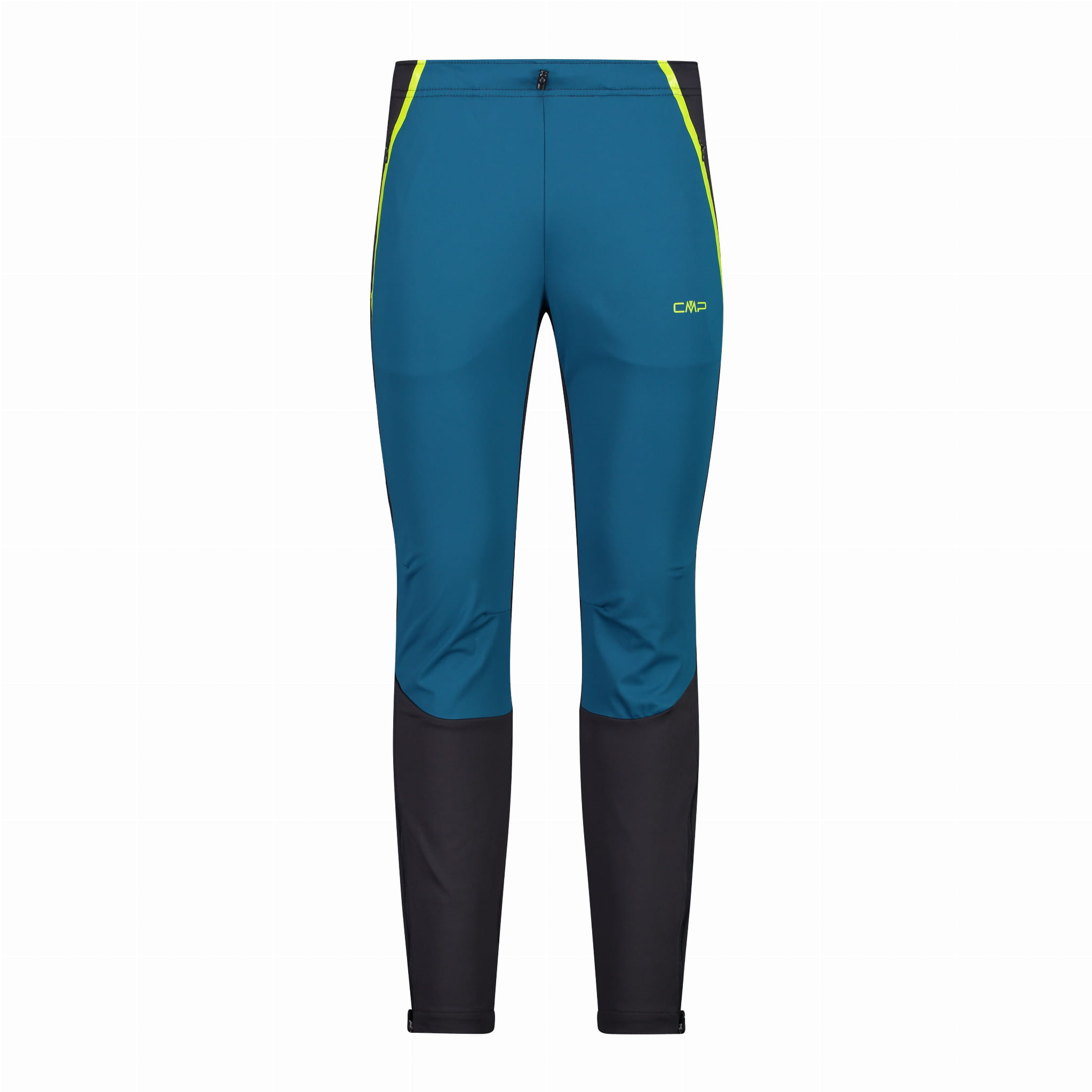 Sportowe spodnie męskie CMP z kolekcji Unlimitech w niebiesko-czarnej kolorystyce z neonowo żółtymi lamówkami. Dopasowany krój z lekko zwężanymi nogawkami wspiera swobodę ruchu, a profilowane kolana ułatwiają pracę nóg podczas aktywności. Model ma elastyczny pas z regulacją sznurkiem oraz dwie boczne kieszenie zapinane na zamki. Na dole nogawek zastosowano wzmocnione panele, rozpięcie oraz elastyczne wykończenie z silikonowym nadrukiem, które pomaga utrzymać nogawkę stabilnie na bucie. Konstrukcja jest wiatroszczelna, a rozmieszczenie materiałów w systemie body mapping dopasowano do stref pracy ciała.