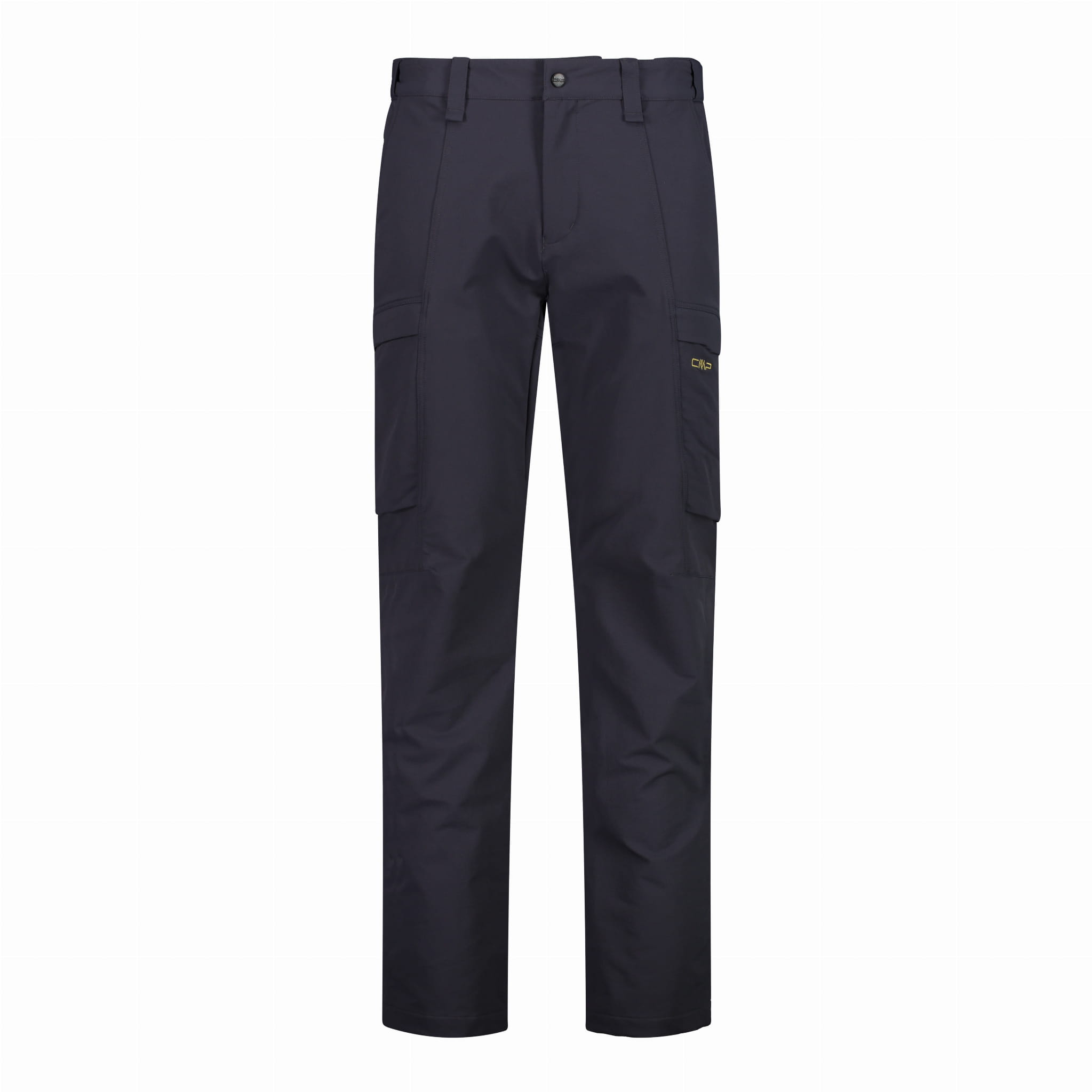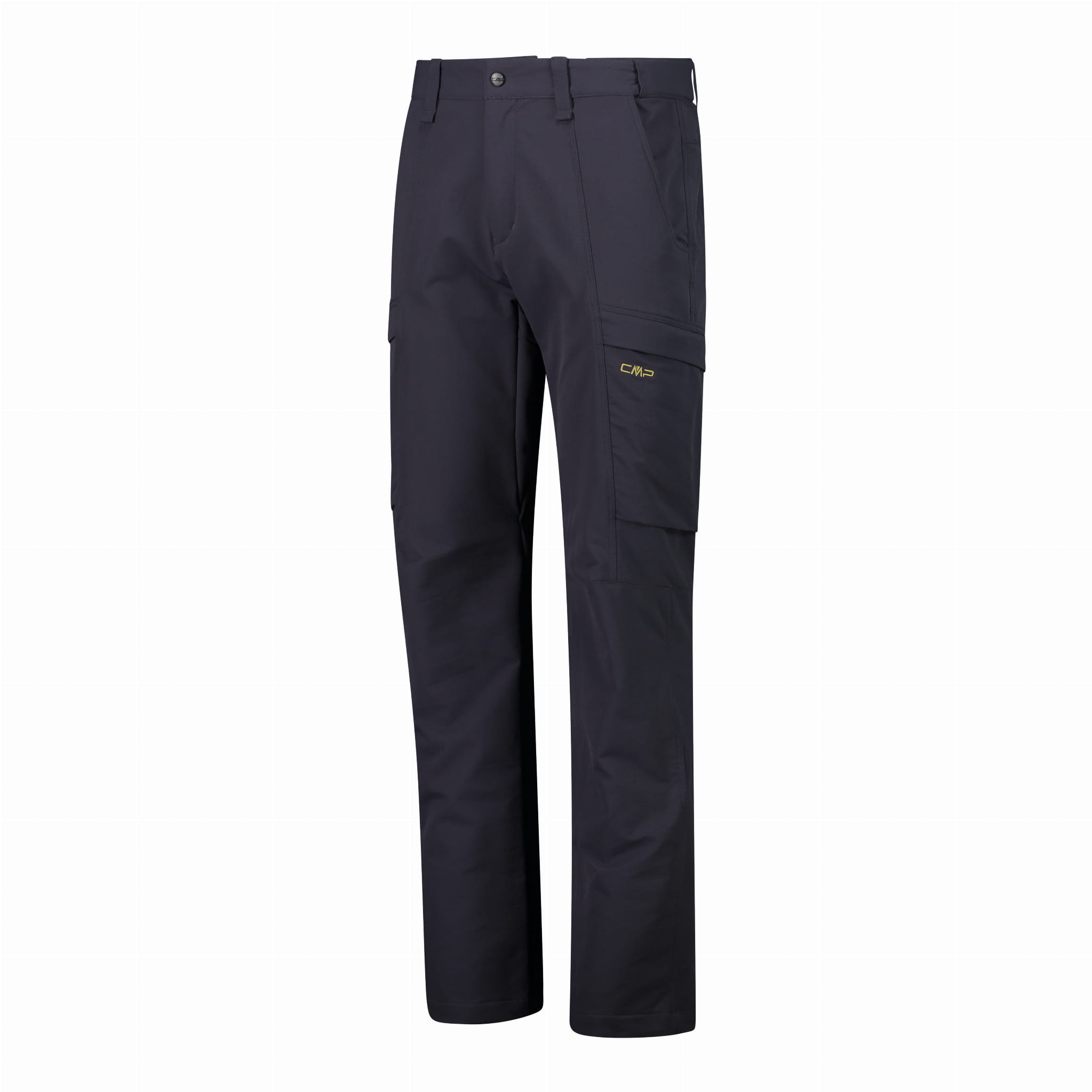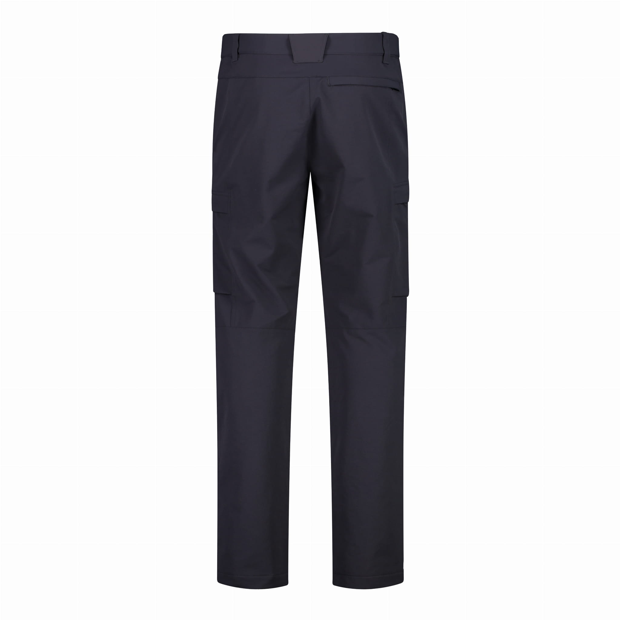 Granatowe spodnie outdoorowe CMP 32T1777/N950 to długi model o prostych nogawkach i regularnym kroju, zaprojektowany do aktywności w terenie. W pasie zastosowano zapięcie na zatrzask oraz rozporek na zamek, a szlufki pozwalają nosić pasek. Praktyczne kieszenie obejmują dwie kieszenie boczne z przodu oraz dwie kieszenie cargo na udach z klapkami. Profilowane przeszycia i panele w okolicy kolan wspierają swobodę ruchu podczas marszu.