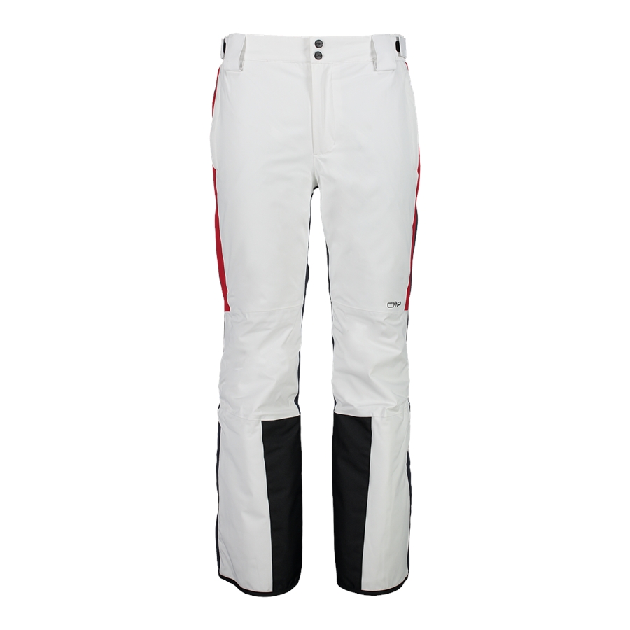 Techniczne męskie spodnie narciarskie CMP z kolekcji Ski w sportowym zestawieniu kolorów: biała baza z czarnymi wstawkami na dole nogawek i czerwonymi panelami po bokach ud. Regularny krój z prostymi nogawkami jest dopasowany w biodrach, a elastyczna tkanina 4-way stretch ułatwia swobodny ruch podczas jazdy. Model ma zapięcie na zamek i dwa zatrzaski, szlufki na pasek oraz regulowany, elastyczny pas. Dwie kieszenie boczne na zamek pozwalają bezpiecznie schować drobiazgi. Wewnątrz zastosowano elastyczny fartuch przeciwśnieżny z silikonowym nadrukiem antypoślizgowym, a wzmocniony dół nogawek i rozpięcie u dołu pomagają w dopasowaniu do butów narciarskich.