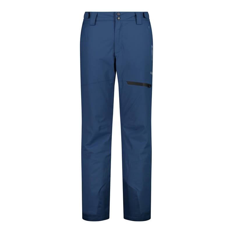 Granatowe męskie spodnie narciarskie CMP z kolekcji Ski to techniczny model o regularnym kroju i prostych nogawkach na pełną długość. Pas zapinany na zamek i dwa zatrzaski ma szlufki na pasek oraz regulację na rzep, co ułatwia stabilne dopasowanie. Układ kieszeni obejmuje dwie kieszenie boczne na zamki oraz kieszeń na udzie z poziomym zamkiem w kontrastowym, czarnym kolorze. Wewnątrz zastosowano elastyczny fartuch przeciwśnieżny z antypoślizgowym nadrukiem silikonowym, a dół nogawek został wzmocniony. Za ochronę w zimowych warunkach odpowiada membrana Clima Protect®, hydrofobowe wykończenie, w pełni podklejane szwy oraz ocieplenie Feel Warm Flat 80 g.