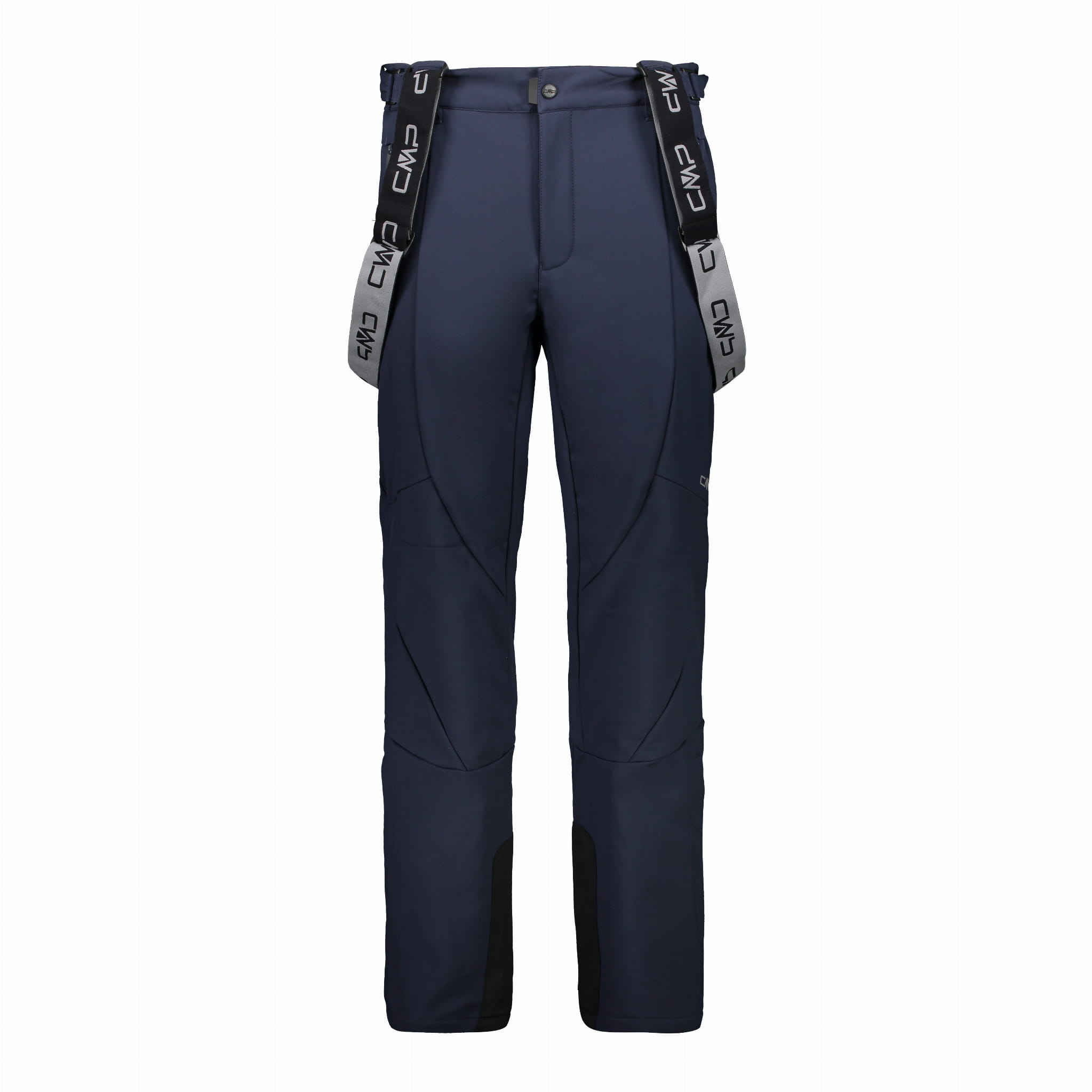 Granatowe męskie spodnie narciarskie CMP z softshellu to funkcjonalna propozycja na dni na stoku. Model ma prosty krój regular, podwyższony stan oraz odpinane szelki z regulacją na klamrach. W pasie zastosowano zapięcie na zatrzask, szlufki na pasek i regulację na rzep, co ułatwia stabilne dopasowanie. Profilowane kolana oraz panele na nogawkach wspierają swobodę ruchu, a wzmocnienia po wewnętrznej stronie dołu nogawek pomagają chronić materiał w newralgicznych miejscach. Wewnątrz znajdują się elastyczne fartuchy przeciwśnieżne z antypoślizgowym nadrukiem silikonowym, a rozpięcie u dołu nogawki ułatwia dopasowanie do butów narciarskich.