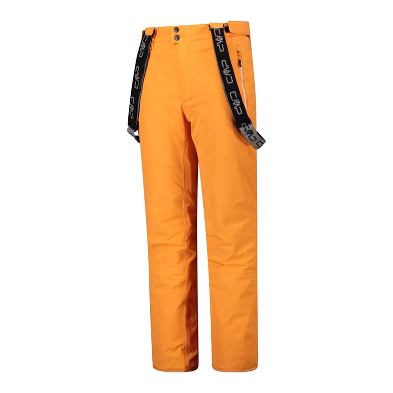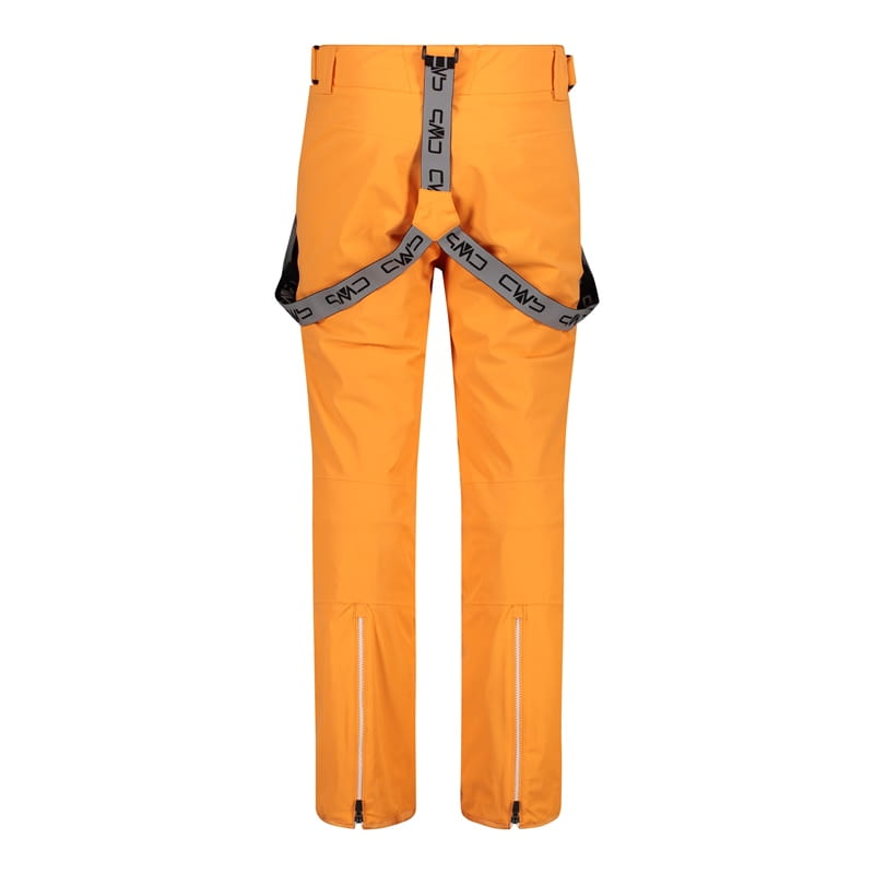 Gładkie męskie spodnie narciarskie CMP z kolekcji Ski w intensywnym pomarańczowym kolorze, zaprojektowane do jazdy na stoku i zimowych aktywności. Regularny, średnio dopasowany krój z prostymi nogawkami oraz elastyczność w 4 kierunkach wspierają swobodę ruchu, a profilowane kolana ułatwiają pracę nóg podczas zjazdów. Model ma odpinane szelki z nadrukiem CMP, pas zapinany na dwa zatrzaski, rozporek z zamkiem oraz szlufki na pasek. Dwie boczne kieszenie na zamek pomagają bezpiecznie schować drobiazgi. Wewnątrz zastosowano elastyczny fartuch przeciwśnieżny z antypoślizgowym nadrukiem silikonowym, a u dołu nogawek znajduje się rozpięcie, które ułatwia dopasowanie do butów narciarskich.