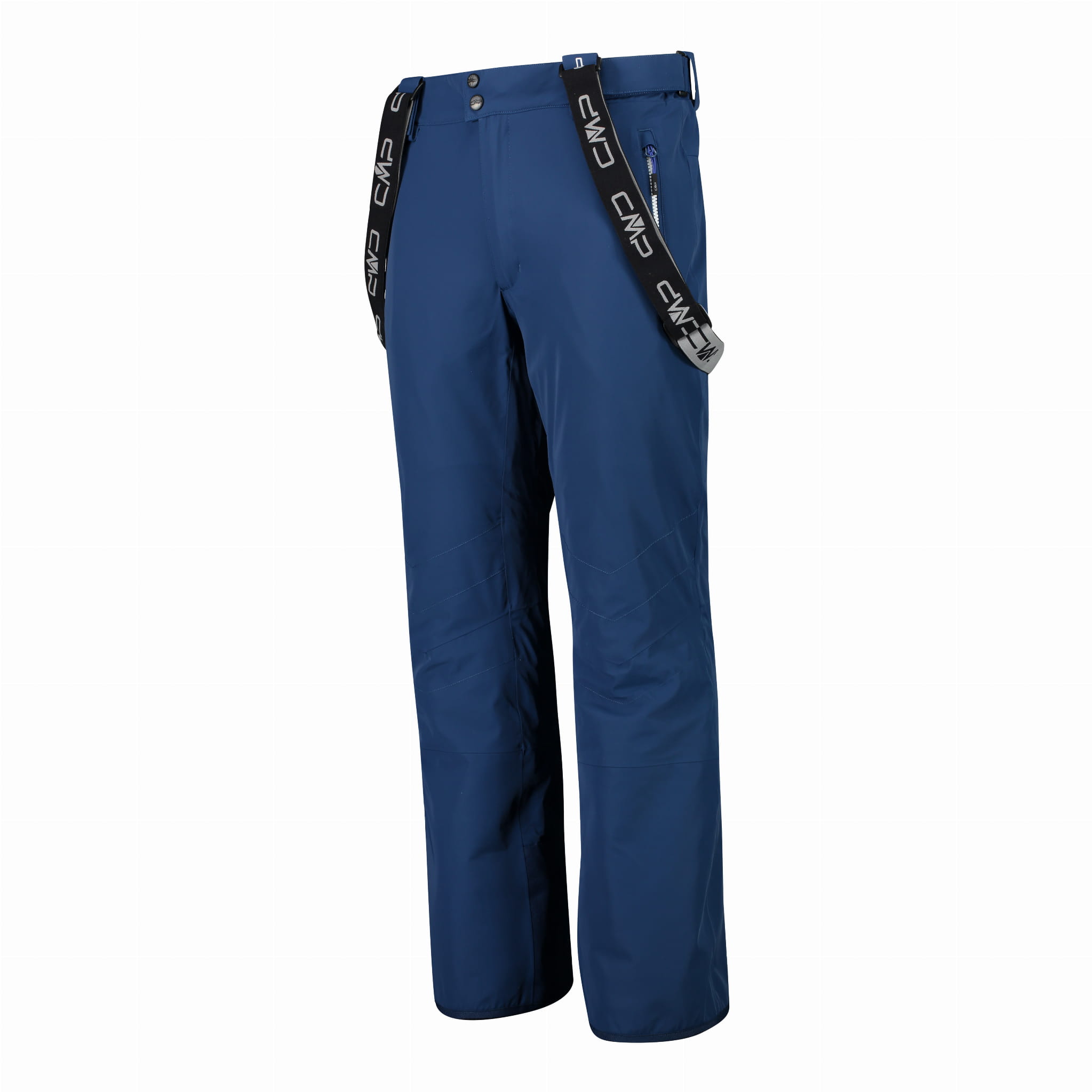 Gładkie męskie spodnie narciarskie CMP z kolekcji Ski w granatowym kolorze, zaprojektowane do jazdy na stoku i zimowych aktywności. Regularny krój z prostymi nogawkami jest średnio dopasowany w udach, a elastyczność w 4 kierunkach wspiera swobodę ruchu. Model ma wysoki pas z szerokimi szlufkami na pasek, zapięcie na dwa zatrzaski oraz rozporek z zamkiem. Odpinane szelki z elastycznych taśm pomagają utrzymać spodnie na miejscu podczas ruchu. Dwie boczne kieszenie na zamki pozwalają bezpiecznie schować drobiazgi, a profilowane przeszycia w okolicy kolan ułatwiają pracę nóg. W dolnej części nogawek zastosowano wzmocnione panele po wewnętrznej stronie oraz rozpięcie u dołu nogawki. W środku znajduje się elastyczny fartuch przeciwśnieżny z antypoślizgowym nadrukiem silikonowym oraz ocieplenie Feel Warm Flat 120 g.
