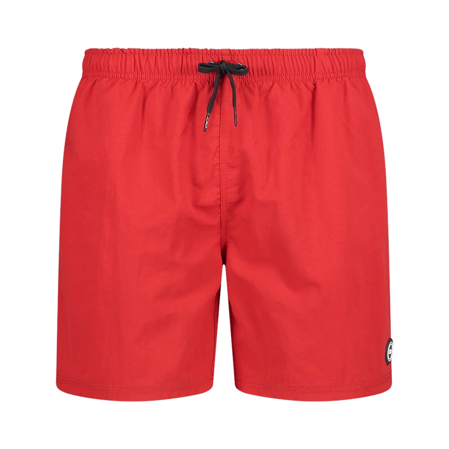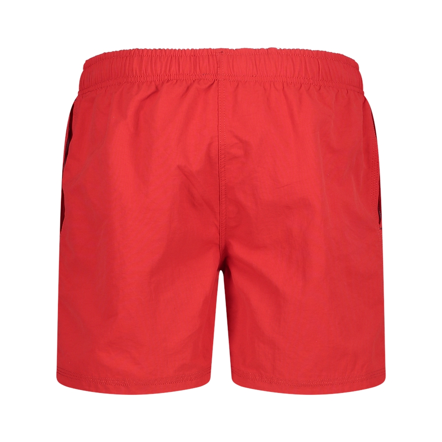 Te męskie szorty kąpielowe CMP z kolekcji BEACH to gładkie, czerwone bermudy o luźniejszym kroju i długości do połowy uda. Elastyczny pas z marszczeniem oraz regulacja czarnym sznurkiem pomagają utrzymać wygodne dopasowanie, a przeszycie na środku z przodu podkreśla sportowy charakter modelu. Po bokach znajdują się dwie praktyczne kieszenie, a przy dolnej krawędzi nogawki umieszczono małe, okrągłe logo.