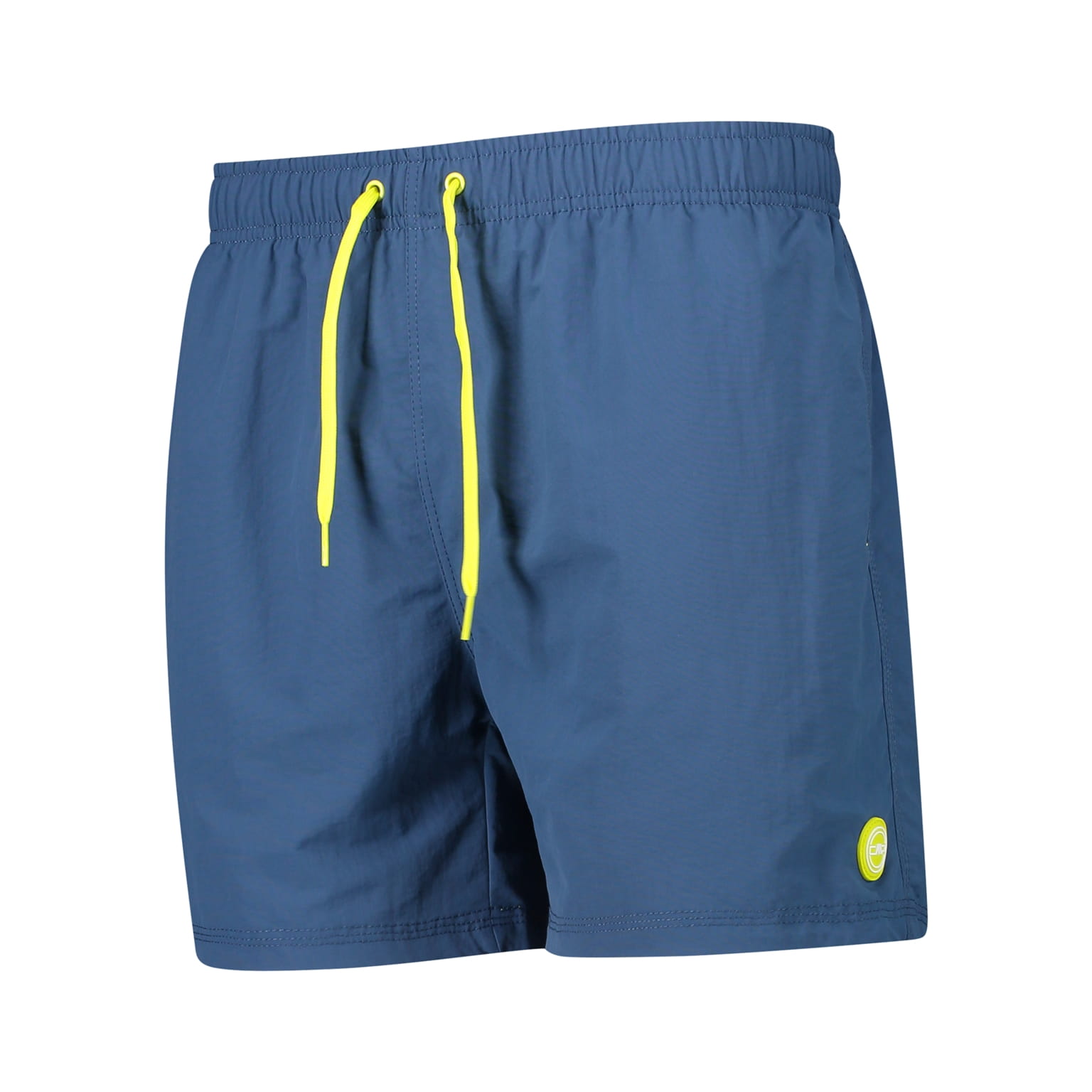 Niebieskie szorty kąpielowe CMP z kolekcji BEACH to proste, krótkie spodenki o długości do połowy uda. Elastyczny pas z marszczeniem oraz ściągacz z kontrastowymi, żółtymi troczkami przechodzącymi przez metalowe oczka pomagają utrzymać stabilne dopasowanie. Gładki materiał z poliamidu jest lekki, a wewnętrzna podszewka z poliestru podnosi komfort noszenia. Z przodu widoczny jest rozporek z przeszyciem, a podwójne przeszycia przy dolnych krawędziach nogawek wzmacniają wykończenie.